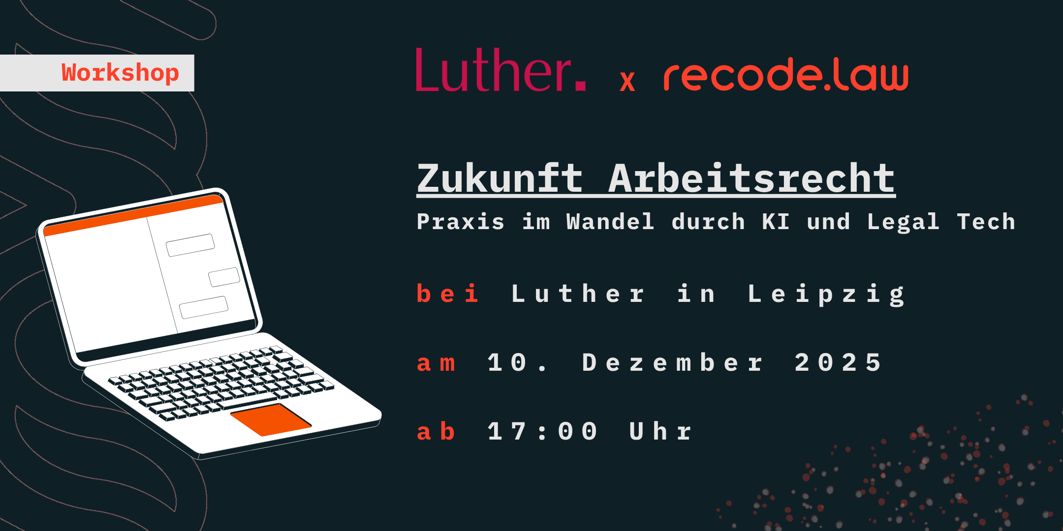 Künstliche Intelligenz verändert die juristische Arbeitspraxis tiefgreifend – auch im Arbeitsrecht. Automatisierte Prozesse und der Einsatz von KI schaffen Effizienz und eröffnen neue Möglichkeiten für die (anwaltliche) Praxis. Gemeinsam mit der Kanzlei Luther laden wir euch am 10. Dezember 2025 ab 17 Uhr nach Leipzig ein, um diese Entwicklung aus nächster Nähe zu erleben.
